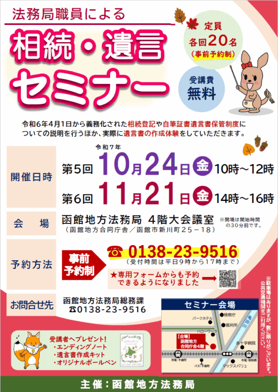 2025年10月20日 / 最終更新日時 : 2025年10月20日 いーハコダテ事務局スタッフ 函館地方法務局 法務局相続・遺言セミナー(2025/10) 主催者より:令和6年4月1日から義務化された相続登記や自筆証書遺言書保管制度について函館地方法務局職員が説明を行うほか、遺言書の作成体験をしていただきます(要予約申し込み)。 日時:2025/10/24(金) 10時から12時 場所:函館地方法務局 4階大会議室 関連ブックマーク 函館地方法務局 イベント情報 イベント詳細 日付: 2025年10月24日 10:00 – 12:00 会場: 函館地方法務局 カテゴリ: 講演・セミナー